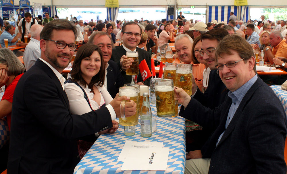 Beste Stimmung im Festzelt in Aufhausen: Als prominente Redner kamen Staatssekretär Florian Pronold ‚(li.) und SPD- Bundesvize Ralf Stegner (re.). Mit dabei: (v.l.) Juso- Bundesvorsitzende Johanna Uekermann, Bezirksvorsitzender Franz Schindler, MdL, Bundestagskandidat Dr. Tobias Hammerl, Bezirkstagsvizepräsident Norbert Hartl, Margit Wild, MdL, und Bürgermeister (Wenzenbach) Sebastian Koch.